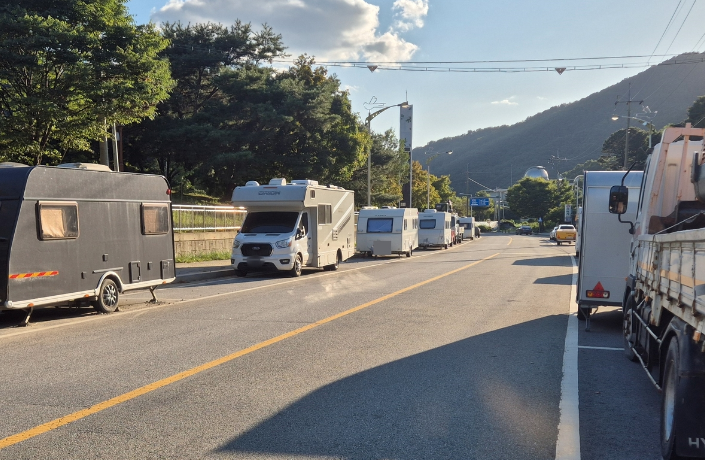 청주랜드 우암어린이회관부터 상당산성 옛길 입구까지 이어진 노상 주차장(주차면 255면)에는 크고 작은 캠핑카와 캠핑 트레일러 40여 대가 길게 늘어져 있었는데요. 언뜻 봐도 수개월간 이동 하나 없이 장기간 주차된 것으로 보이긴 합니다.