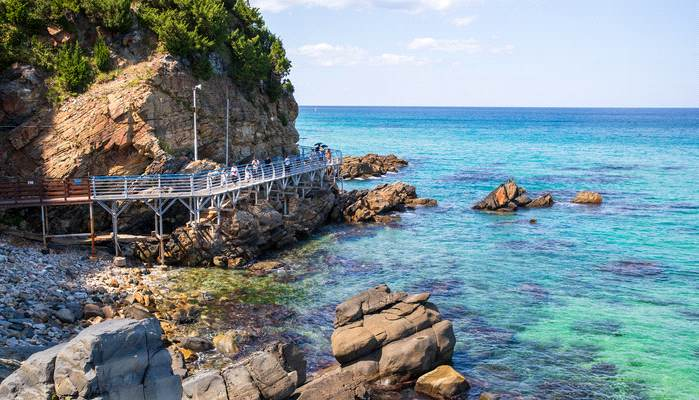 해안 길을 따라 조성된 산책로에서 푸른 동해와 웅장한 절벽이 어우러진 아름다운 풍경을 감상해 보시길 바랍니다.