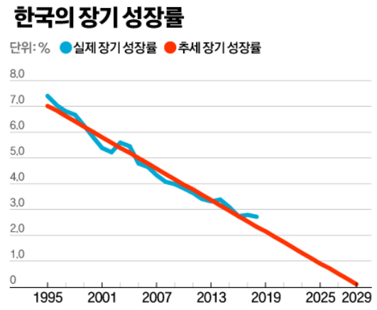 한국은 앞으로 장기 경제성장률 0%대에 진입하며, '제로 성장의 빙하기'에 접어들 것으로 보인다고 합니다.