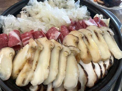 송이버섯을 취급하는 식당에서 샤부샤부를 주문하면 채소와 다양한 버섯이 담긴 냄비가 나오는데, 여러 채소를 넣고 끓인 채수에 송이버섯과 고기를 넣고 살짝 데치면 됩니다.