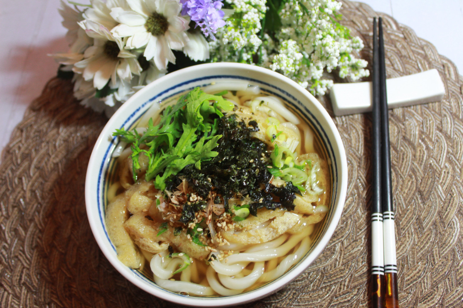 * 조리법 : 다시마와 표고를 넣어 끓인 물에 풋고추, 홍고추, 감자옹심이를 넣고, 우동면과 유부를 추가하여 끓입니다. 간장이나 연두로 맛을 내고, 튀김과 쑥갓, 김가루, 고추가루로 토핑 합니다.