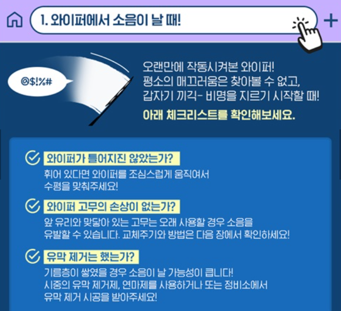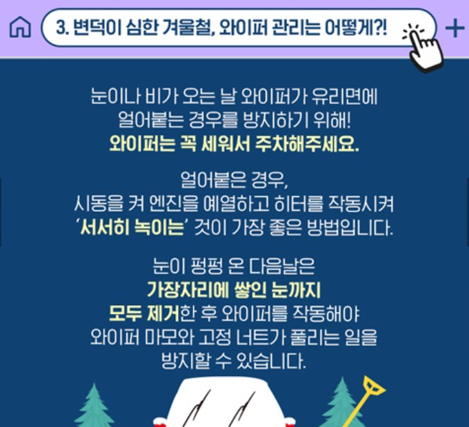 - 영하로 떨어지는 날, 주차 시 와이퍼 날을 세워 놓거나, 두꺼운 종이를 와이퍼와 유리 사이에 끼워놓음