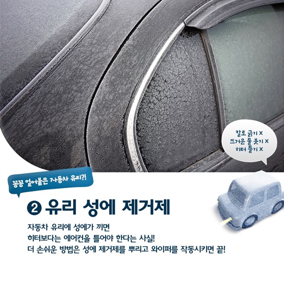 * 동결된 차 유리에 절대 금지 행위 : 칼로 긁기, 뜨거운 물 붓기, 히터 틀기
