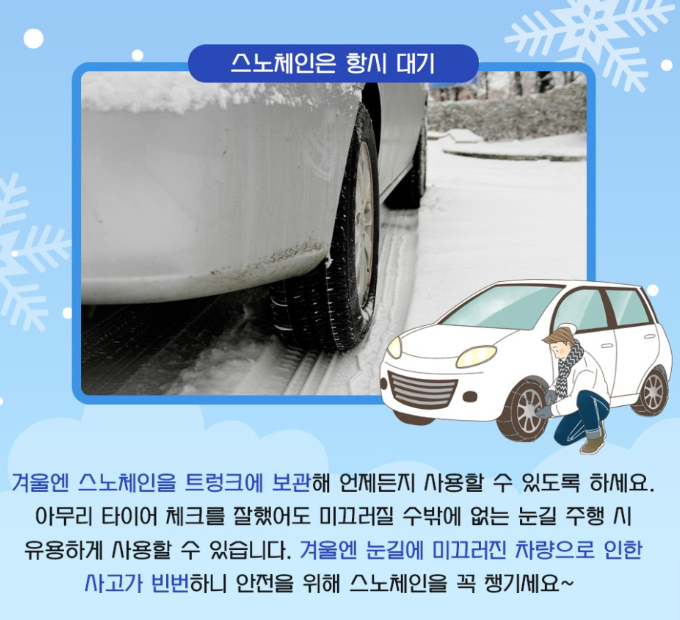 - 겨울엔 스노체인을 트렁크에 보관해 언제든지 사용 가능토록 관리