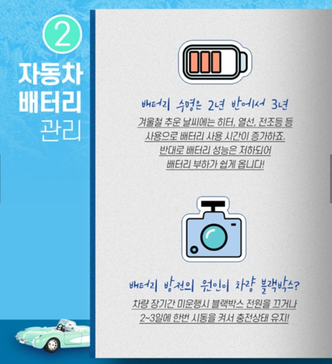 * 배터리는 온도에 민감하기 때문에 추워질수록 성능이 낮아지므로, 수시로 배터리액을 확인하고 청소하는 것이 좋음