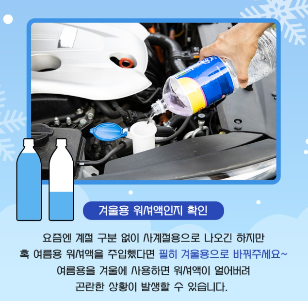 - 요즘엔 계절 구분 없이 사계절용으로 나오긴 하지만, 혹 여름용 워셔액을 주입했다면 필히 겨울용으로 교체