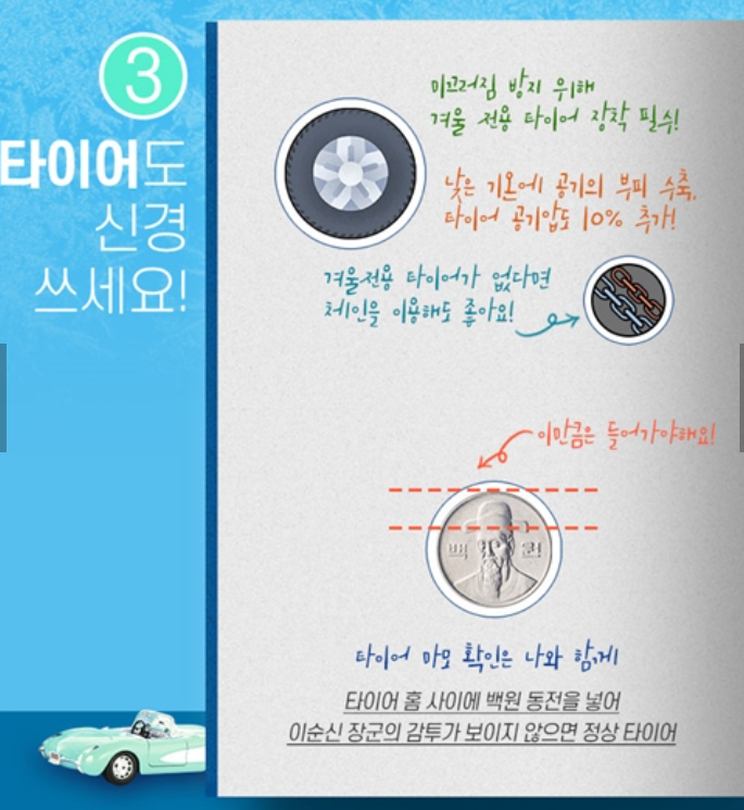 단, 타이어는 정속으로 달리면서 길들이는 시간을 거쳐야 하니 실제 사용 1~2주 전에 교체하는 게 좋습니다. 겨울철, 타이어 점검으로 안전 운전하세요.