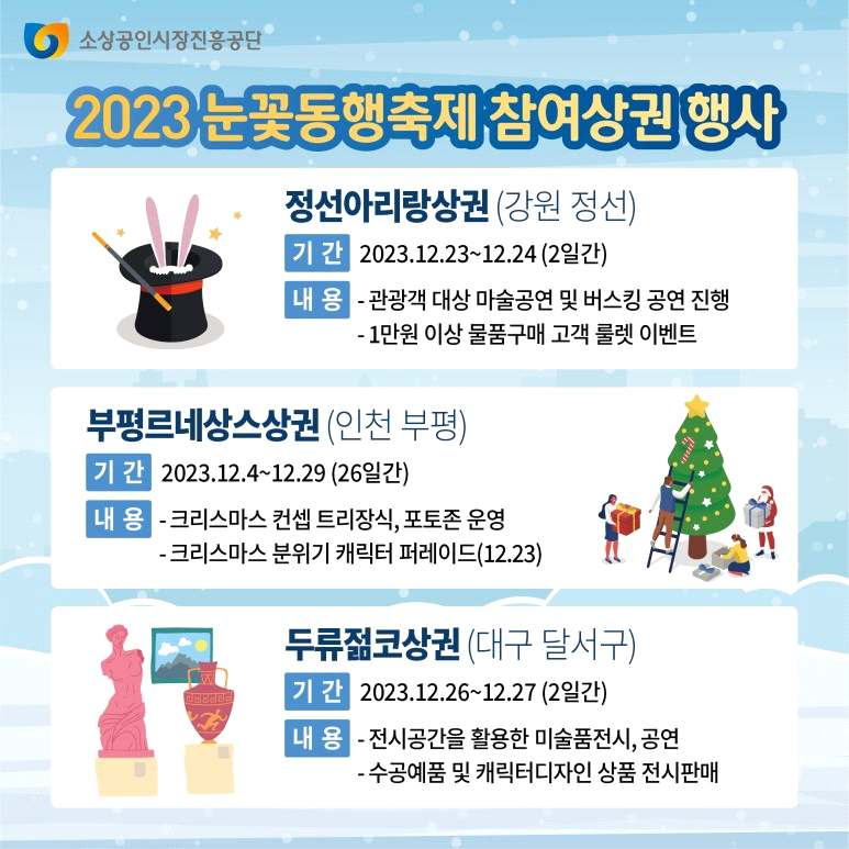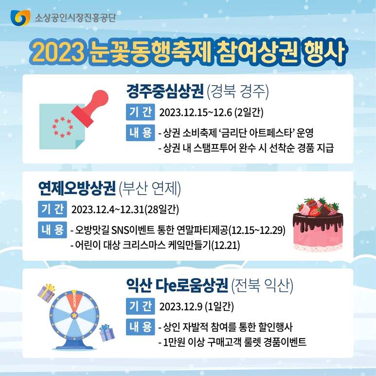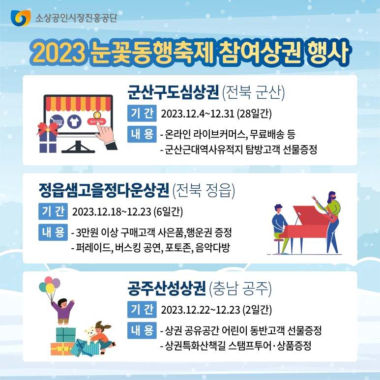- 공주 산성 상권, 대구 두류 젊코상권 등 전국 주요 상권 11곳에서는 크리스마스‧연말연시를 맞아 구매 고객에 경품 제공 이벤트 등을 실시