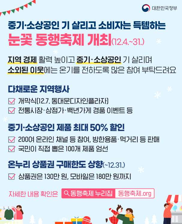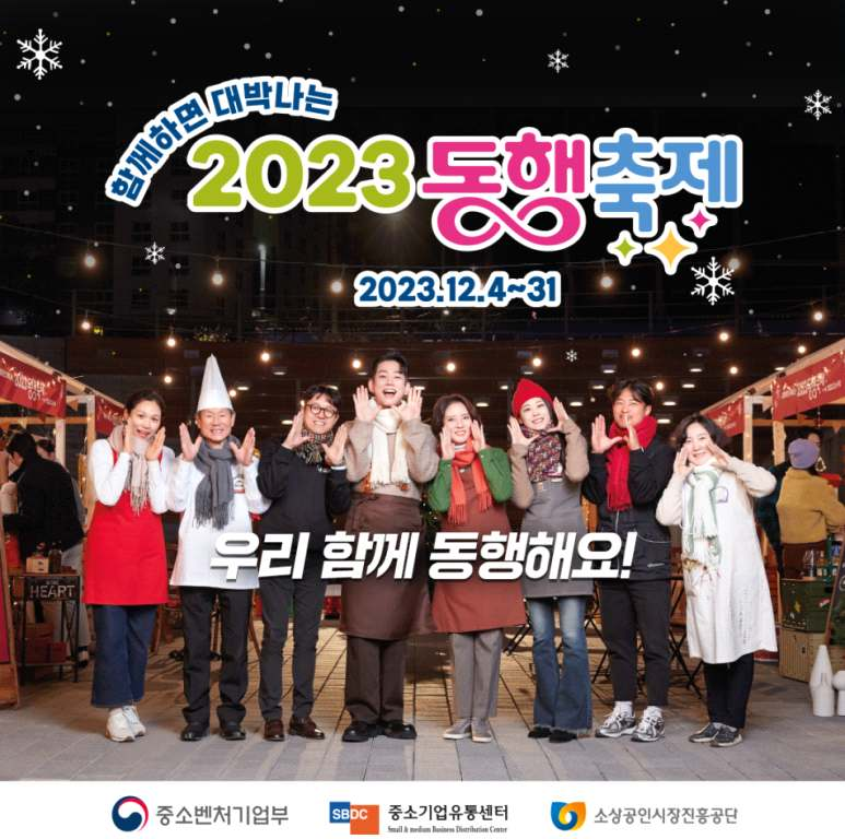 이번 동행축제는 5월 봄빛, 9월 황금녘 동행축제에 이은, 올해 3번째 동행축제입니다. 대형 유통사, 중소기업, 소상공인, 전통시장, 온라인까지 온 국민 힘을 모아 경제활력을 만드는 동행축제가 온기를 곳곳에 전하는 '온 국민, 힘 모아 온기(溫氣) 나눔' 캠페인, 2023 눈꽃 동행축제로 돌아왔습니다.