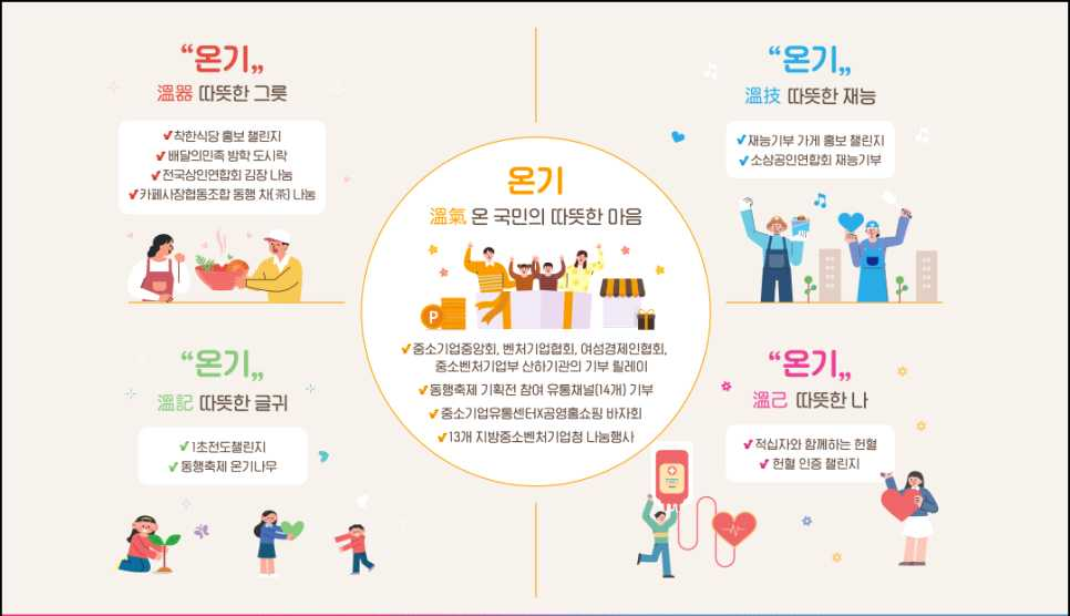 - 중소기업중앙회, 한국벤처기업협회, 한국여성경제인협회 및 동행축제 기획전에 참여한 유통채널 14개와 중소벤처기업부 산하기관들은 기부금 또는 물품 기부