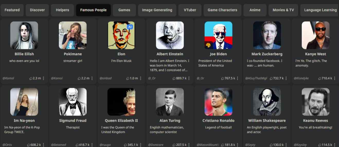 캐릭터닷 AI는 셰익스피어 같은 과거의 실존 인물이나 해리 포터 같은 픽션 속 캐릭터와 대화할 수 있다는 점에 주목받아 폭발적으로 성장했습니다.