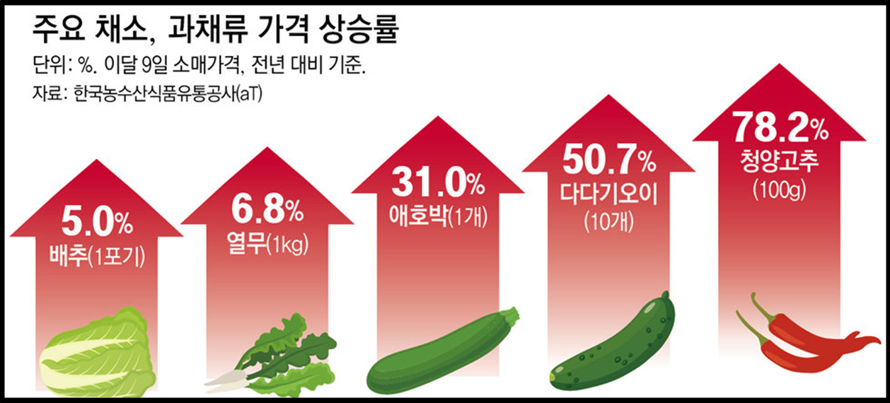 올여름 집중호우와 무더위에 생육 부진으로 오이값 1.5배 상승, 애호박 31%, 청양고추 78% 급등에 금(金) 사과에 이어 폭염에 채소값 폭등이 이어지고 있습니다. 그리고 식자재값은 오르는데 손님은 줄어들어 외식업 경기는 코로나 창궐 때와 같이 침체국면에 돌입했습니다.