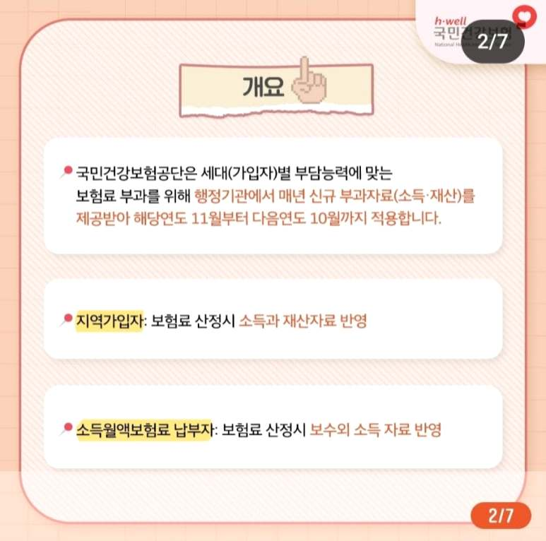 국민건강보험공단은 세대(가입자) 별 부담 능력에 맞는 보험료 부과를 위해, 행정기관에서 매년 신규 부과 자료(소득·재산)를 제공받아, 해당 연도 11월부터 다음 연도 10월까지 적용하고 있습니다. 2023년 11월부터 건강보험료가 변동된 이유에 대해 좀 더 상세히 알아보도록 하겠습니다.