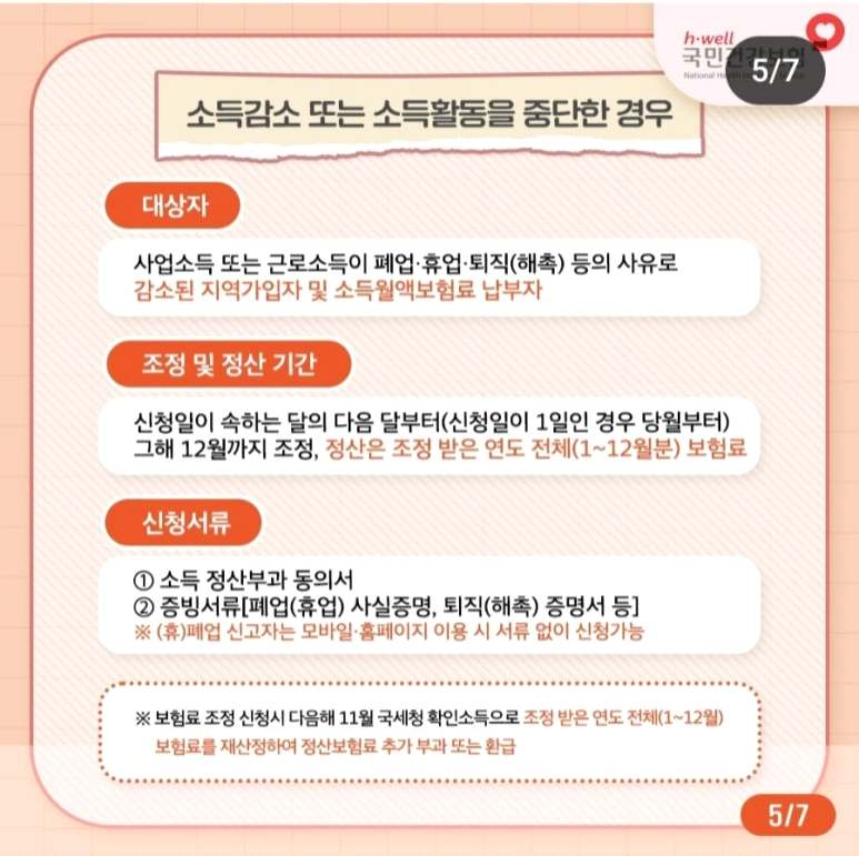 휴 · 폐업 등으로 소득 활동을 중단했거나 소득이 감소한 경우, 구비서류를 제출해 소득 정산 신청 후 보험료를 조정받으며, 이때 조정한 건강보험료는 국세청으로부터 2023년 귀속 소득자료가 연계되는 2024년 11월에 재산정돼 추가 부과 또는 환급됩니다.