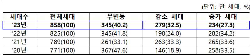 - 보험료 변동이 없는 세대는 345만 세대(40.2%), 감소 세대는 279만 세대(32.5%), 증가 세대는 234만 세대(27.3%)