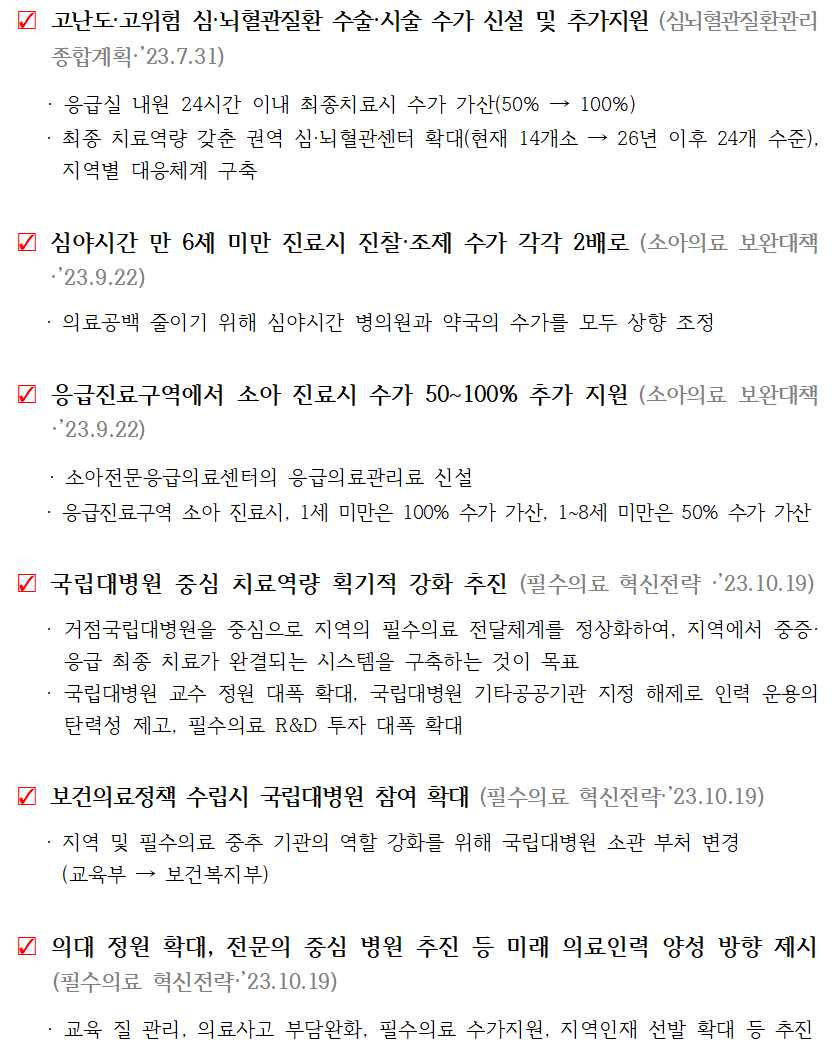 다시 말해, 우리 의료계가 전공의 의존에서 벗어나 전문의 중심으로 정상화되도록 돕는 방안, 전공의들의 처우를 개선하는 방안, 의료인들이 의료소송 불안감에 시달리지 않고 진료에만 집중할 수 있도록 의료사고 안전망을 구축하는 방안 등이 알차게 들어있습니다.