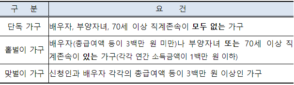 - 단독가구 : 2,200만 원, 홑벌이 가구 : 3,200만 원, 맞벌이 가구 : 3,800만 원 미만