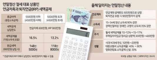 - 연금 계좌 공제 한도 400만 원(퇴직연금 포함 700만 원) → 600만 원(퇴직연금 포함 900만 원)으로 상향