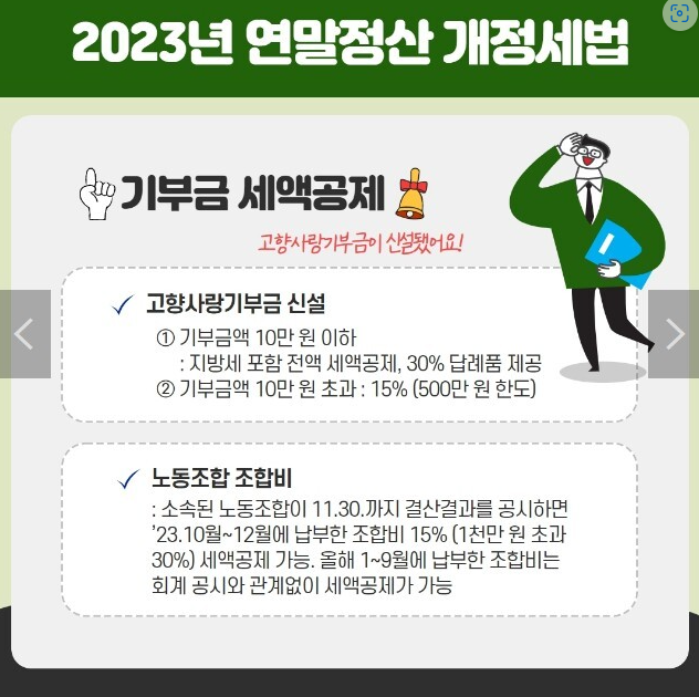 - 소속된 노동조합이 11월 30까지 결산 결과를 공시하면, 23년 10월~12월에 납부한 조합비 15% 세액공제 가능(1천만 원 초과 시 30%)