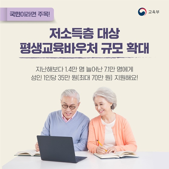 지난해보다 1.4만 명 늘어난 7.1만 명에게 성인 1인당 35만 원(최대 70만 원) 평생교육이용권 혜택을 지원합니다.
