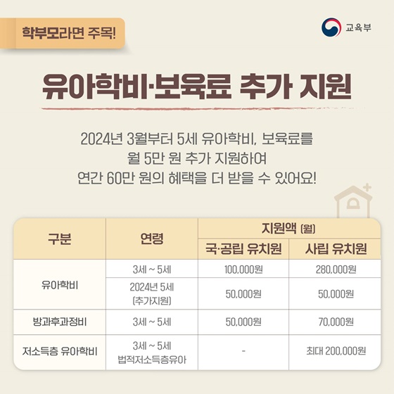 2024년 3월부터 5세 유아 학비, 보육료를 월 5만 원 추가 지원하여 연간 60만 원의 혜택을 더 받을 수 있습니다.