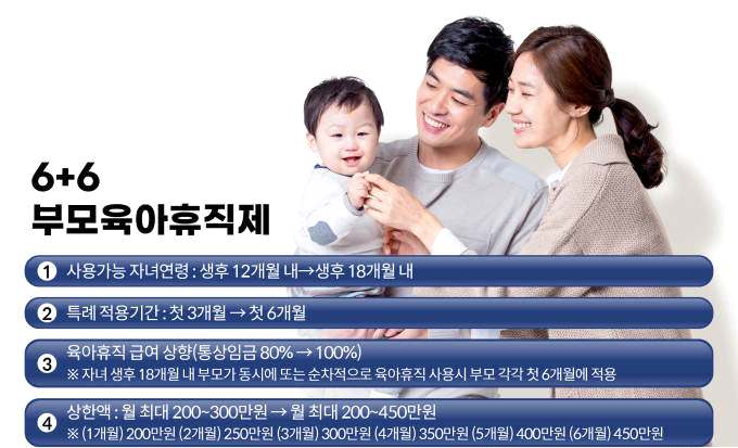 지원 기간이 기존보다 두 배 늘어났습니다. 앞으로는 부모가 모두 육아휴직을 신청할 경우, 첫 6개월 동안 임금의 100%를 육아휴직급여로 받습니다.