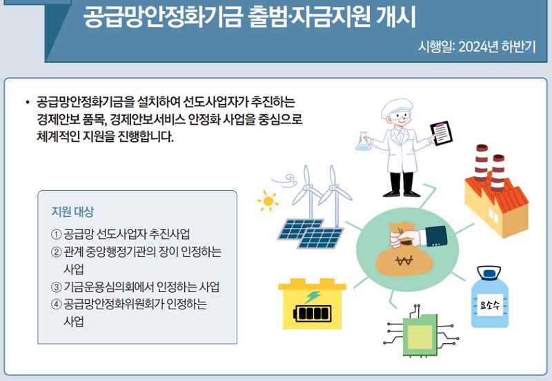 * 올 하반기부터 공급망 위기 대비 및 경제 안보를 위해, 공급망 안정화 기금을 설치해 경제 안보 품목·서비스 안정화 사업을 체계적으로 지원합니다. 지원 대상은 공급망 선도 사업자가 추진하는 사업, 관계 중앙행정기관의 장이 인정하는 사업 등입니다.