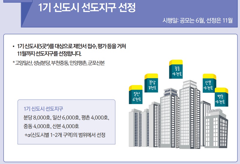 * 1기 신도시 5곳(고양 일산, 성남 부당, 부천 중동, 안양 평촌, 군포 산본)을 대상으로 하는 재개발 사업이, 지난달 사업 공모를 시작으로 오는 11월까지 선도지구 선정에 들어갑니다.