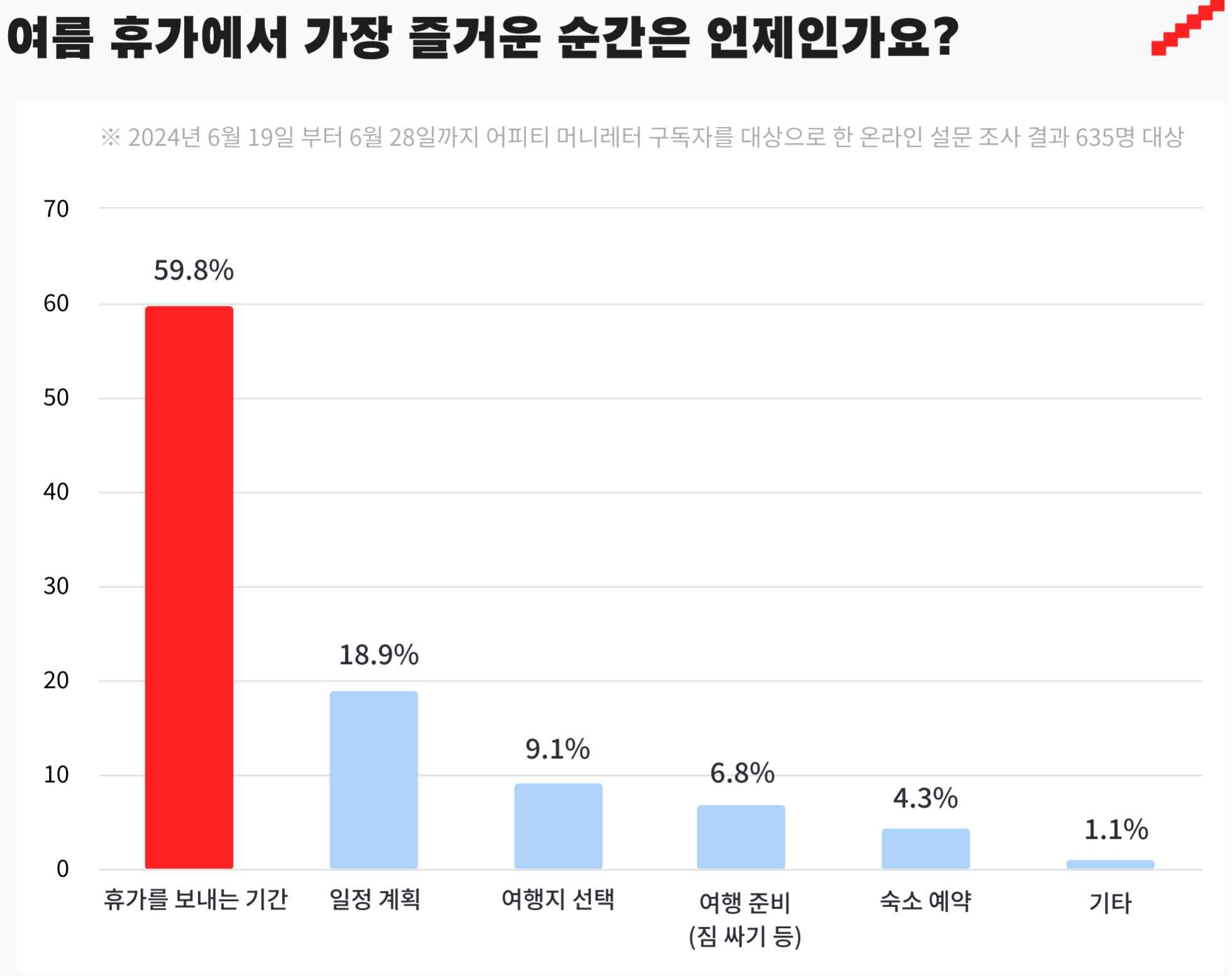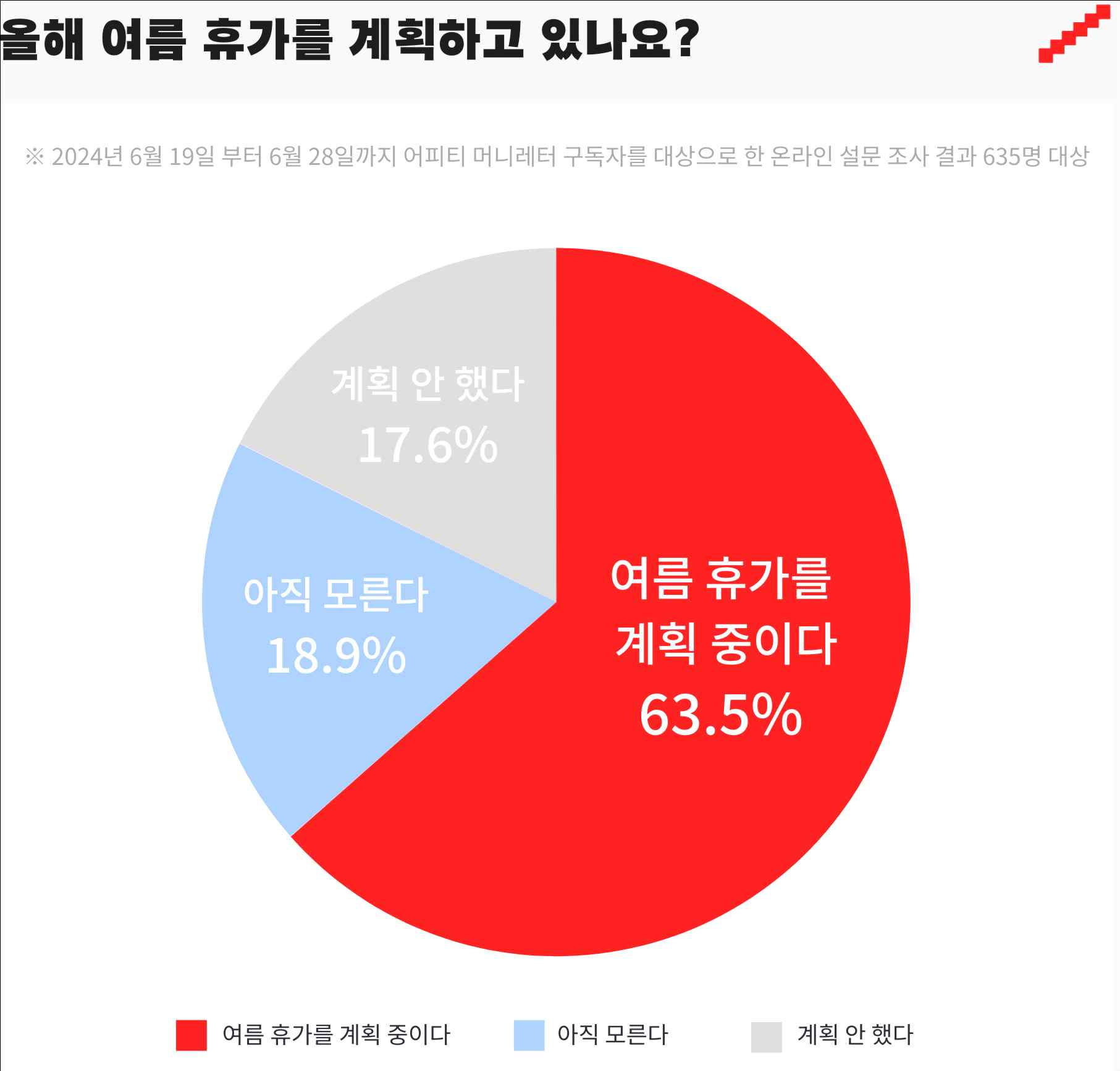 어피티가 635명의 대한민국 MZ세대(1980년대생~2000년대생)에게 올여름휴가 계획을 물었습니다. 2024년 6월 19일부터 6월 28일까지, 어피티 머니레터 구독자를 대상으로 한 온라인 설문조사 결과, 635명 참여하였습니다.