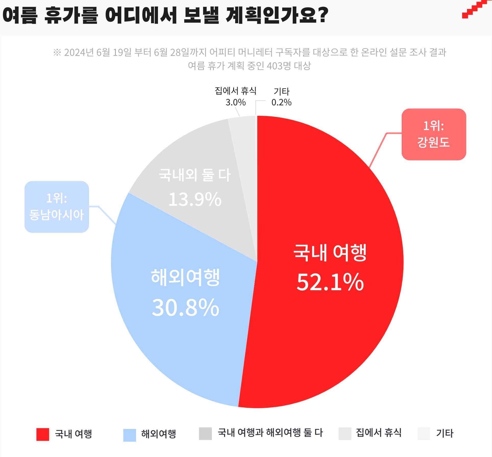 A5. 응답자의 52.1%가 휴가를 국내에서 보낼 계획이라고 답했고, 30.8%가 해외여행을 계획 중이라고 답했습니다. 국내 여행과 해외여행 모두 계획하고 있다는 참여자는 13.9%였습니다.