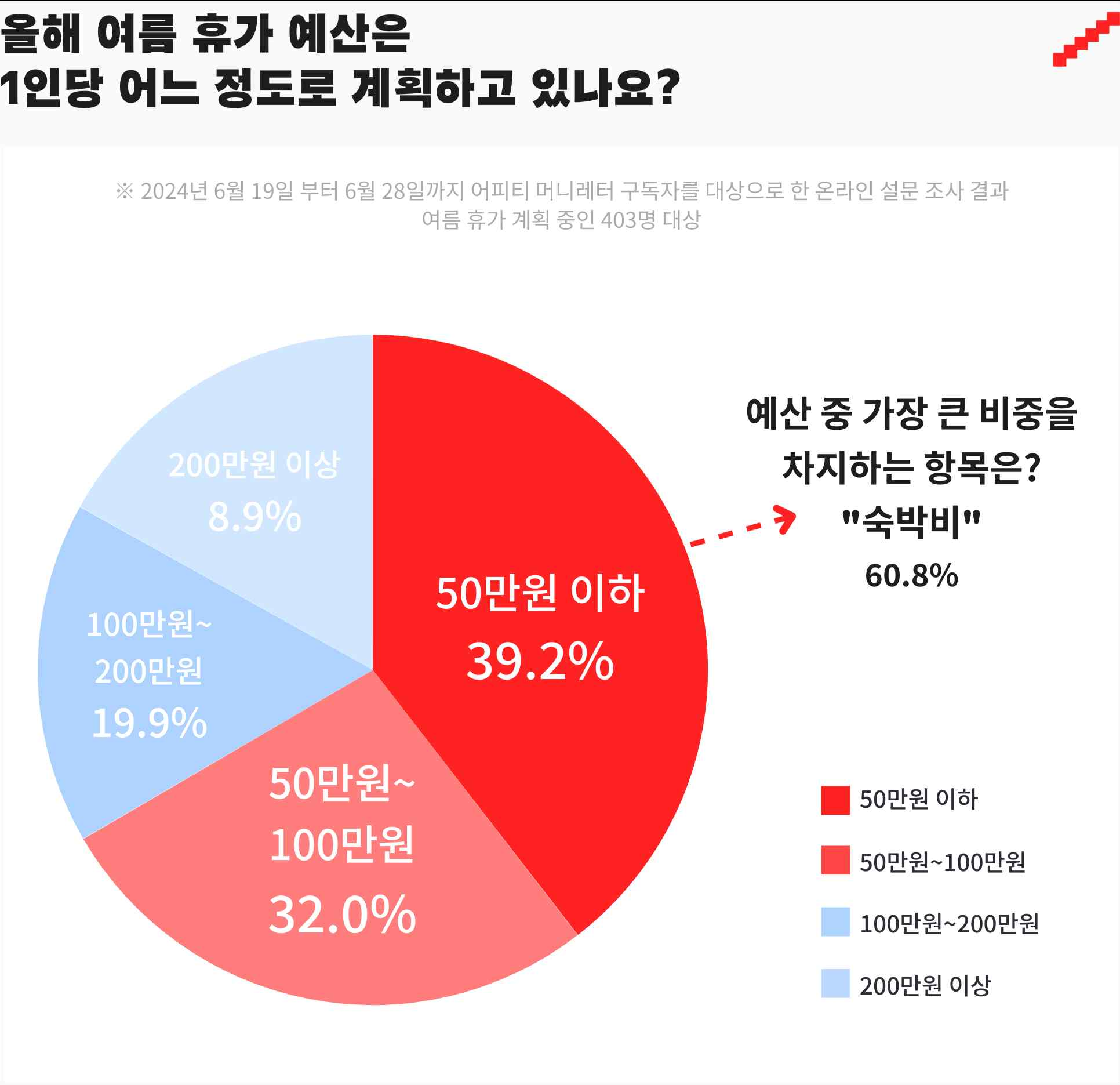 A2. 여름휴가를 계획 중인 설문 참여자 중 39.2%가 1인당 '50만 원 이하'의 예산을 말했습니다. 좀 더 자세히 살펴보면, '50만 원~100만 원(32.0%)', '100만 원~200만 원(19.9%)', '200만 원 이상(8.9%)'로 대다수(71.2%)가 1인당 100만 원 이하의 예산으로 휴가를 계획하고 있었습니다.