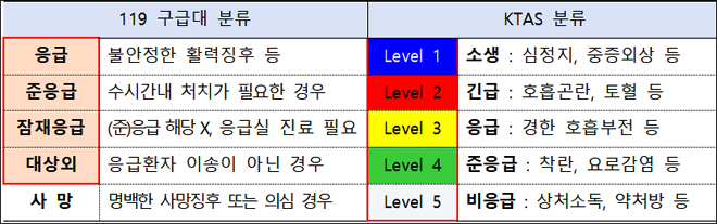 ※ KTAS 의미 : 한국형 응급환자 분류도구(Korean Triage and Acuity Scale)의 의미로 의료진 판단하에 중증환자 먼저 재난 상황선에서 살 가망있는 환자부터 처리하는 것을 말하며, 응급실 상황에 우선순위에 따라 처치가 달라질 수도 있다는 것을 말함