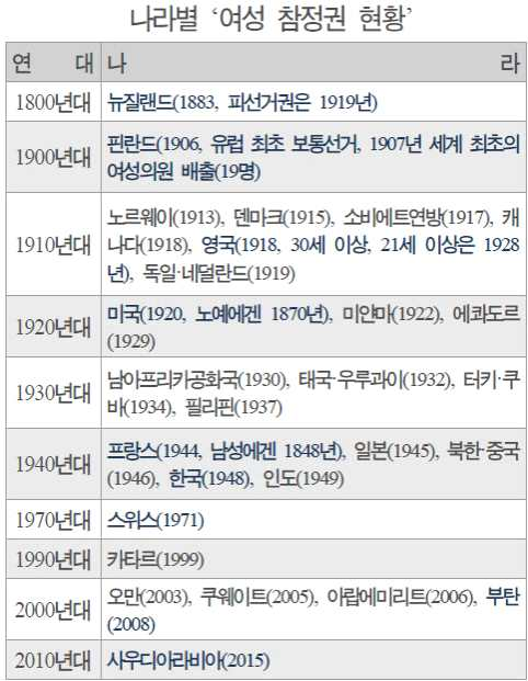 1893년 뉴질랜드에서 세계 최초로 여성들의 참정권이 인정되었으며, 지금은 세계 대부분의 국가에서 여성들도 합법적으로 투표할 수 있게 되었습니다.