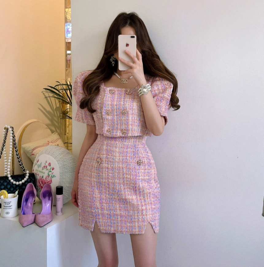 미야 트리밍 트위드 셋업은 고급스러운 트리밍 디테일이 돋보이며, 다양한 색상으로 제공됩니다. 핑크 트위드 재킷 미니 스커트 셋업은 여성스러운 귀여운 스타일로, 데일리 출근룩이나 하객룩으로 적합합니다.