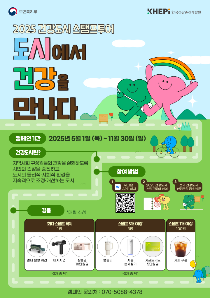 5월 1일부터 11월 30일까지 '2025 건강도시 스탬프투어 도시에서 건강을 만나다' 행사가 펼쳐집니다. 전국 단위로 개최하는 스탬프투어 행사로 누구나 워크온 앱을 통해 참여할 수가 있습니다.