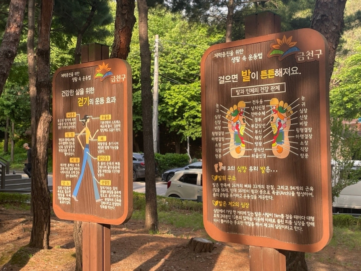 전국 기준 총 306곳으로 모두 시민들의 건강을 증진하고 도심의 환경을 개선하고 조정하기 위한 목적으로 집중적으로 관리되고 있습니다. 산책로 라인에는 이렇게 걷기 운동의 효과와 발의 구조에 관해 설명하는 안내문이 설치되어 있습니다.