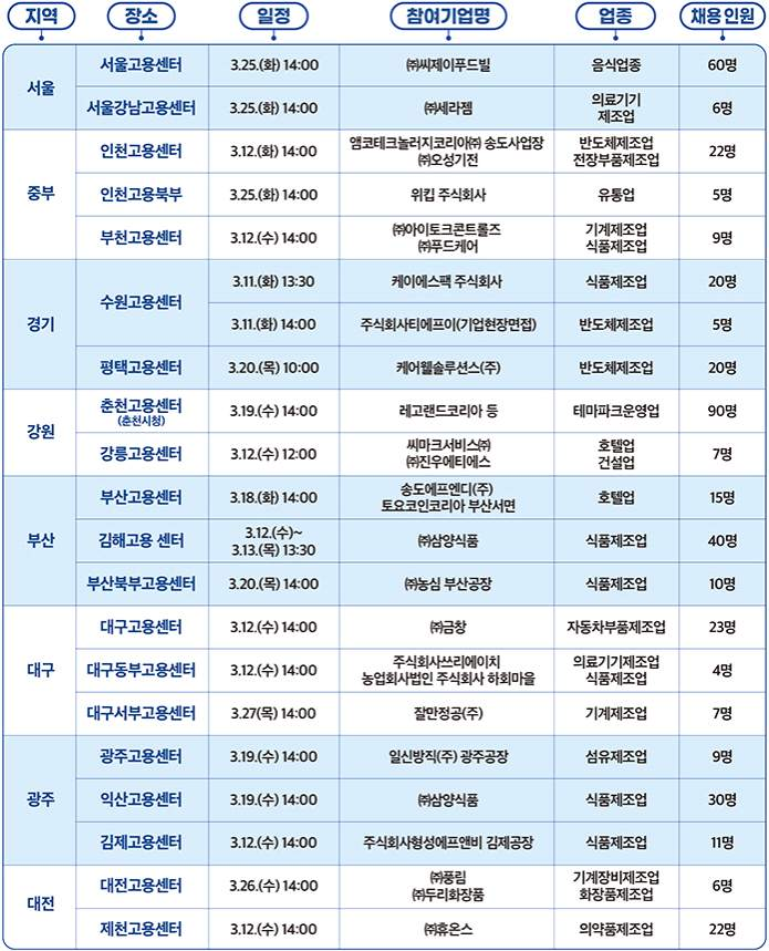 이와 함께 이번 채용박람회의 일환으로 서울·중부·경기·강원·부산·대구·광주·대전 등 각 지역의 고용센터 등에서도 오는 12일부터 25일까지 지역별로 채용행사를 진행할 예정입니다.