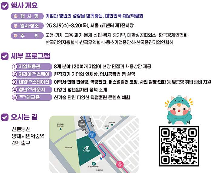 서울 양재 aT센터에서 오는 19일부터 20일까지 삼성전자, 셀트리온, ㈜LG에너지솔루션, ㈜조선호텔 앤 리조트, 컴투스, 에드워드코리아, CAL㈜, ㈜네패스, ㈜이노스페이스 등 약 120개 기업이 참여하는 '2025 대한민국 채용박람회'가 개최됩니다.