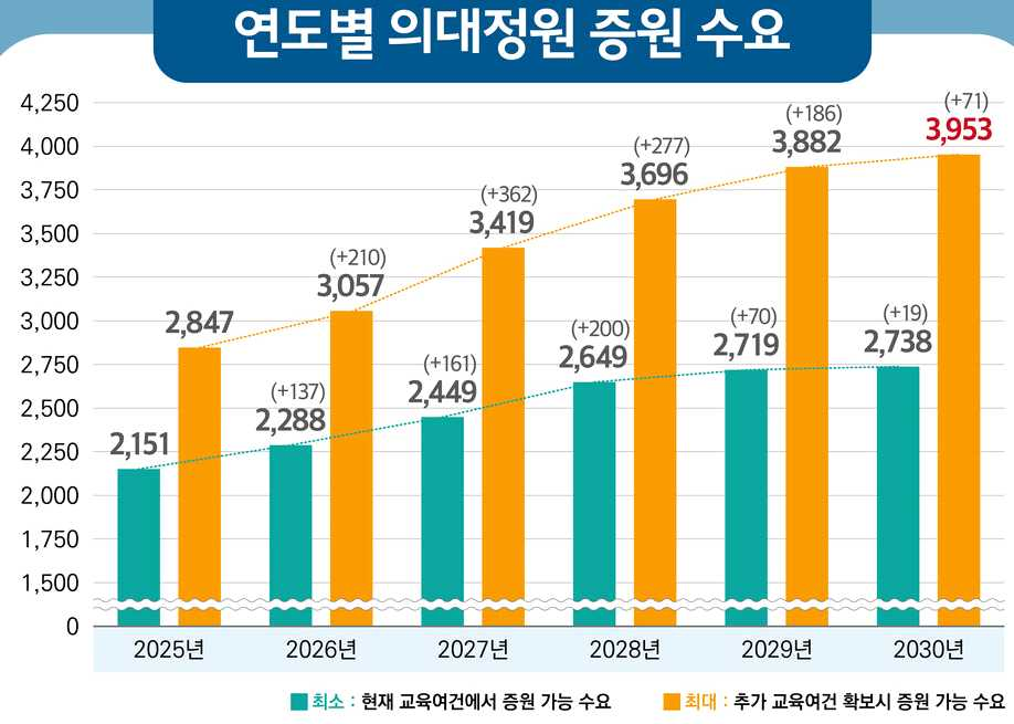 2025학년도 대학 입학전형에서 전국 의대는 전년 대비 1,497명이 늘어난 4,610명의 신입생을 선발한다고 합니다. 전형 유형별로 보면 39개 의과대학은 수시모집으로 3,118명(67.6%), 정시모집으로 1,492명(32.4%)을 각각 뽑는다고 합니다.