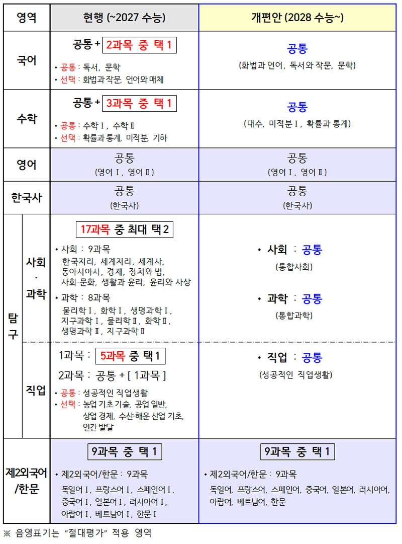 ※ 현행 : 공통(수학Ⅰ, 수학Ⅱ) + 선택 택 1(확률과 통계, 기하, 미적분) / 2028 이후 : 대수, 미적분Ⅰ, 확률과 통계