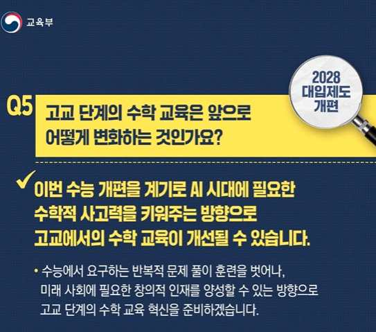 A. 이번 수능 개편을 계기로 AI 시대에 필요한 수학적 사고력을 키워주는 방향으로, 고교에서의 수학 교육이 개선될 수 있습니다.