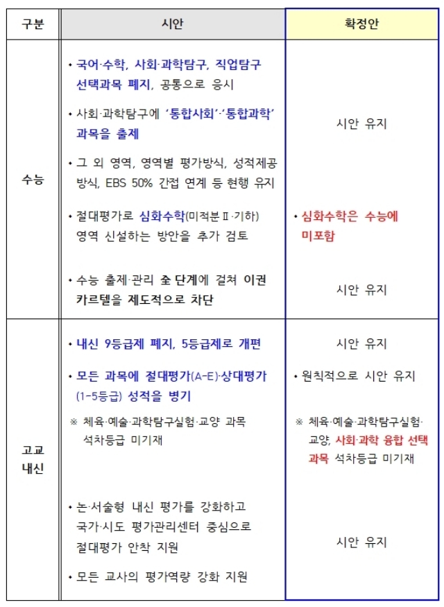또 수능시험 출제에서 '심화 수학(미적분Ⅱ · 기하)'은 제외되고, 고교 내신에서 사회 · 과학 융합 선택 과목은 상대평가 석차 등급이 기재되지 않습니다.