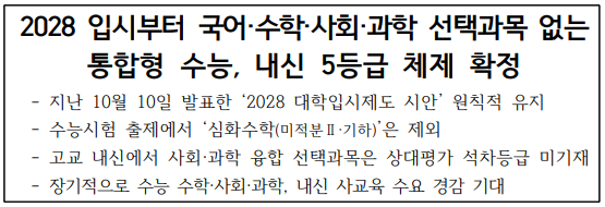 2028학년도 대학수학능력시험부터 모든 수험생의 경우 국어, 수학, 사회, 과학은 선택 과목 없이 통합형으로 시험을 봐야 합니다. 내신은 기존 9등급에서 5등급 체제로 바뀌게 됩니다.