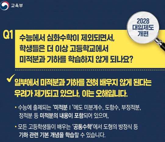 [Q1] 수능에서 심화 수학이 제외되면서, 학생들은 더 이상 고등학교에서 미적분과 기하를 학습하지 않게 되나요?