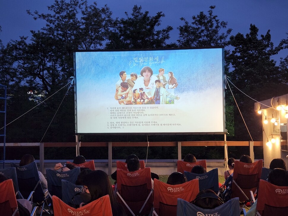 경희궁 숲이 바라보이는 복합 문화 공간 에무는, 서울 도심 한가운데에서 즐기는 루프탑 영화제가 봄을 맞이하여 5월에 돌아온다고 합니다. 고요한 밤하늘 아래, 캠핑 의자에 앉아 각자 헤드셋을 끼고 영화를 관람합니다.