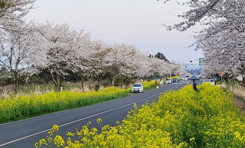 제주 서귀포시 녹산로는 3월 유채꽃과 벚꽃이 만개하는 시기가 겹치면 동화 같은 풍경이 펼쳐집니다. 아스팔트 도로 양 옆 들판은 유채꽃이 가득 메우고, 그 위로는 풍성한 벚꽃이 만개하며 새파란 하늘이 배경이 되어줍니다.
