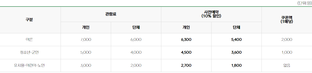 ▷ 입장료 : 어른 7,000원, 청소년·군인 5,000원, 유치원·어린이·노인 3,000원
