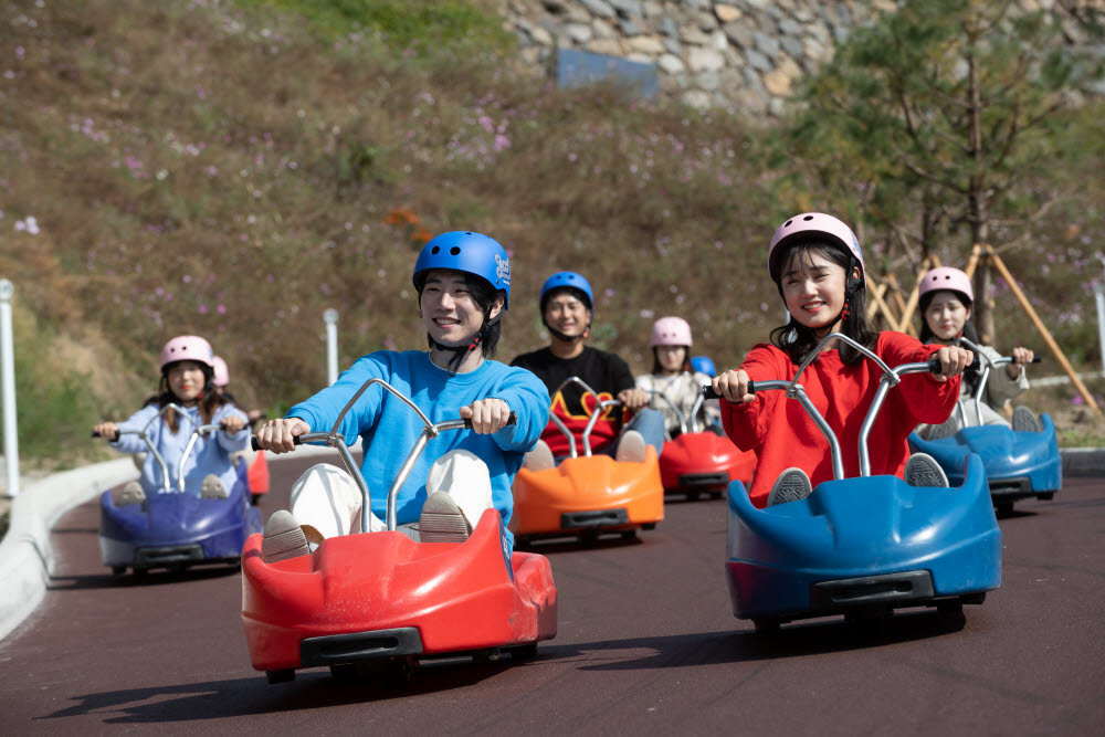 국내 최장 거리의 루지 트랙이 있는 청도 군파크 루지 테마파크입니다. 트랙의 길이만 해도 무려 1.8km로, 꽤 오랜 시간 스카이 리프트를 타고 탑승장까지 이동해야 하는데요. 리프트를 타는 동안 청량한 청도의 자연경관이 파노라마로 펼쳐집니다.
