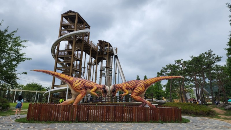 전북 익산의 공룡테마공원 내에는 아이들과 어른들을 위한 액티비티 시설이 가득한 '다이노 키즈월드'가 조성되어 있습니다. 특히 아파트 8층 높이의 수직 미끄럼틀은 아이뿐 아니라, 어른들도 스릴을 즐기며 이용하는 모습을 볼 수 있습니다.