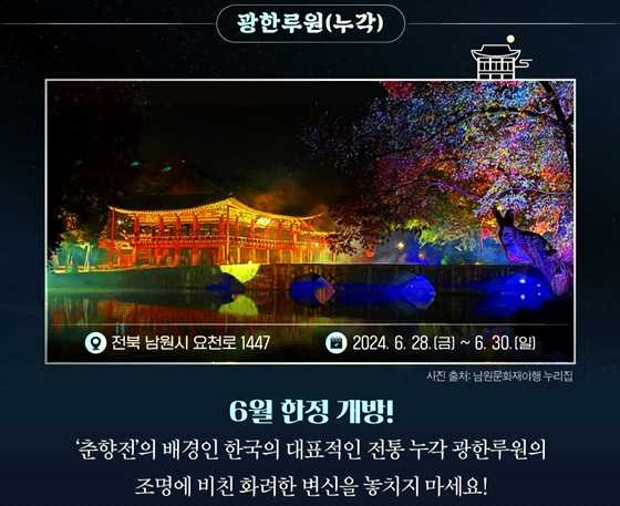 6월에 한정되어 개방되며, '춘향전'의 배경인 한국의 대표적인 전통 누각 광한루원의 조명에 비친 화려한 변신을 놓치지 마세요.